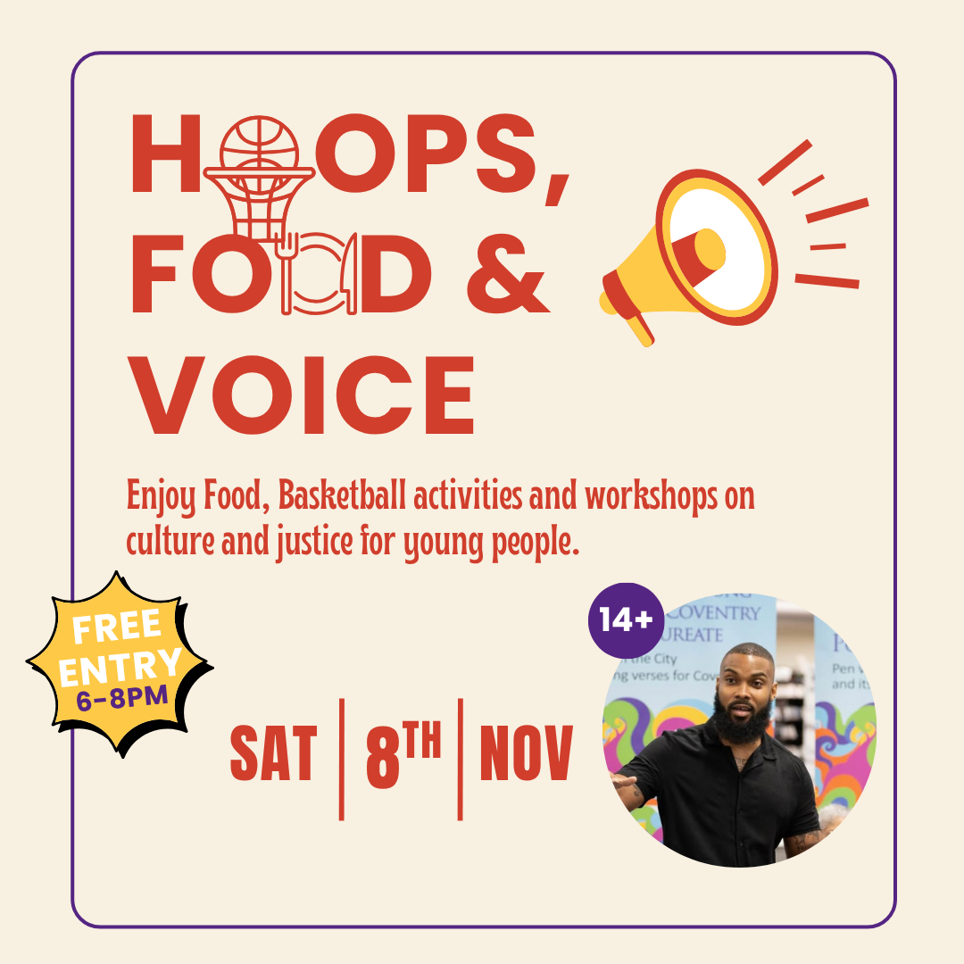Guardian Ballers invites young people aged 14+ to Hoops, Food, and Voice – a free 2-hour experience combining basketball, food, and creativity. Expect high-energy hoops, shared meals, and powerful spoken word led by Coventry Poet Laureate John Bernard